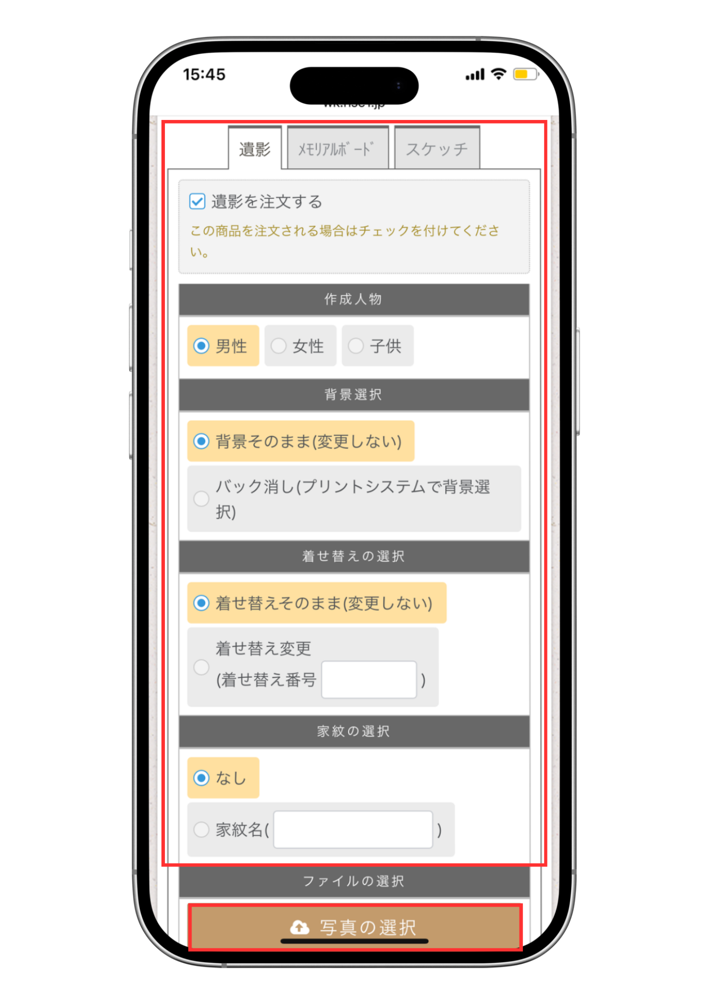 ①遺影写真を注文するにチェックを入れます。