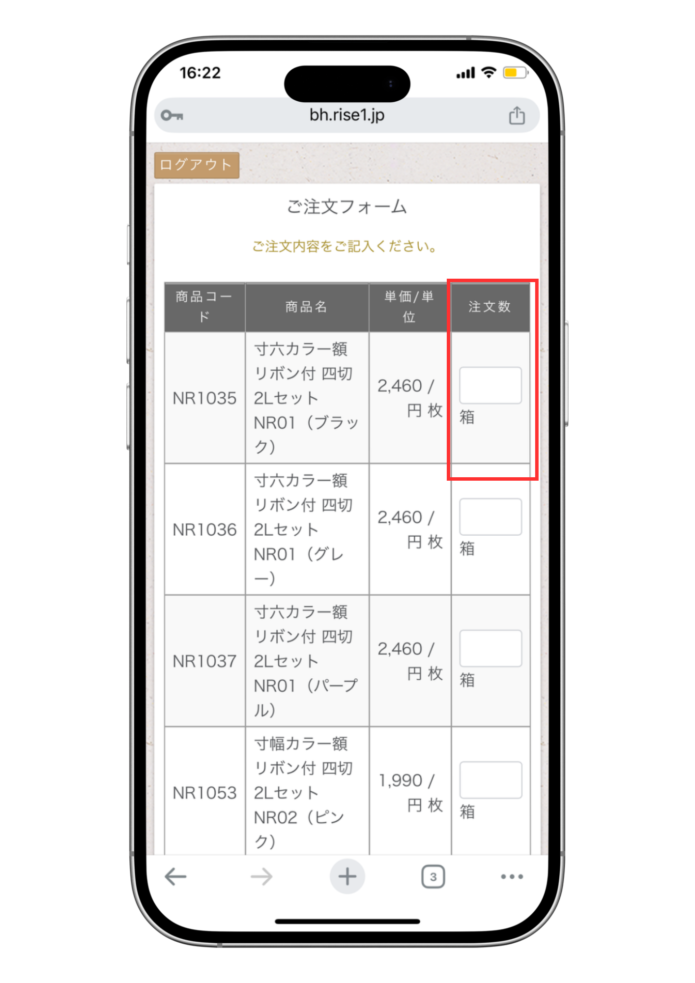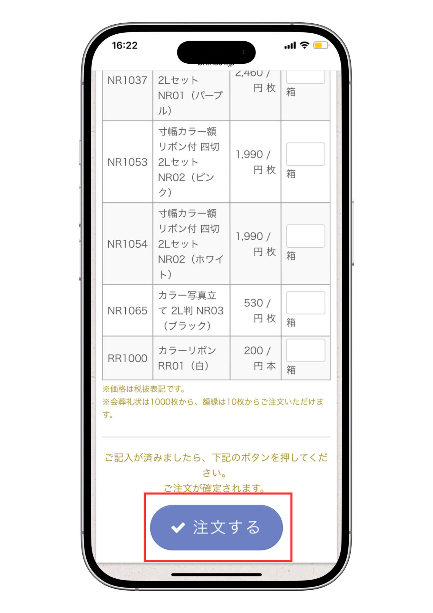 ①赤枠内に商品の注文枚数を入力します。
